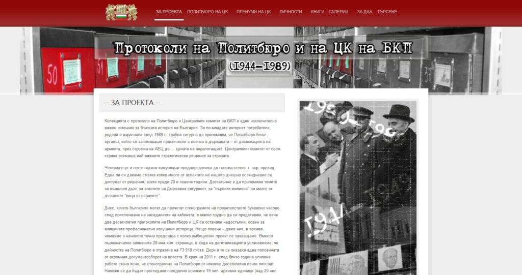 S obzirom na činjenicu da je savremeno bugarsko društvo više od tri decenije udaljeno od perioda četrdesetopetogodišnje vladavine kumunizma, Državna agencija ,,Arhivi“ pristupila je objavi obimne arhivske građe ranije dostupne samo nekolicini profesionalnih istoričara. Onlajn platforma Protokoli Politbiroa i Centralnog komiteta Bugarske komunističke partije sadrži preko dve stotine hiljada stranica arhivskih dokumenata raspoređenih prema decenijama u dva posebna niza. U odeljku sa Protokolima su posebno izdvojena tajna dokumenta (tzv. Odluke „B“). Kad je započet rad na ovom projektu 2011. godine uspostavilo se da arhivske građe ima mnogo više nego što je prvobitno mapirano, a nedostajući stenogrami Politbiroa pronalaženi su pojedinačnim pregledima preko 20.000 fascikli. Nakon uvida u arhivsku građu odlučeno je da se određena količina podataka za koje je procenjeno da su osetljivi isključi sa portala, ali ti dokumenti su u potpunosti dostupni u čitaonicama arhivskih ustanova. U pitanju su informacije o doušnicima državne bezbednosti, lični podaci nejavnih ličnosti, ili informacije u vezi sa njihovim zdravstvenim stanjem. Da bi uneli malo više kolorita u često jednolične i sive tonove partijskih izveštaja, autori projekta su obogatili sadržaj portala i odeljkom sa galerijama fotografija. Od dodatnih sekcija tu su još i hronološke tabele događaja u svetu prema dekadama, biografski leksikon, kao i deo sa odabranim naslovima istoriografske literature koji se odnose na ovaj period bugarske istorije.